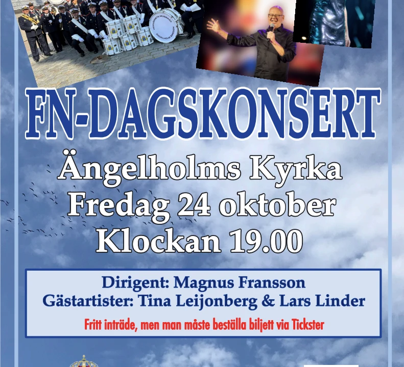Biljett Köp biljett Välkomna till Hemvärnets Musikkår Ängelholms FN-dagskonsert den 24:e oktober klockan 19:00. Gästartister är Tina Leijonberg och Lars Linder Inträdet är GRATIS, men man måste boka en biljett via Tickster för att få en plats.